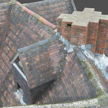 Nearly 3000 images were used to generate and render an accurately georeferenced 3D model of the roof and building exterior. This was used to generate orthographic plans and elevations, which in turn were used to produce a CAD drawing of the roof and details.